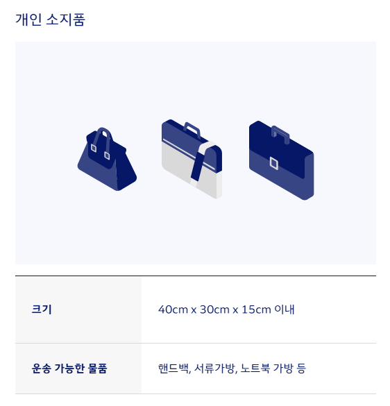 - 개수: 기내 반입 1개 + 개인 소지품 1개 가능 (예: 노트북 가방, 핸드백)