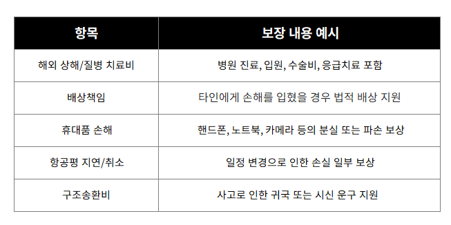 > 일부 보장은 있지만 **휴대품 손해나 구조송환비 미포함**일 수 있어 보완 필요합니다.
